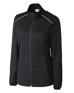 Bonded soft shell fabric~Mock Neck with chin guard~Reverse coil zipper(s)~Elastic cuffs~Reflective piping details~Front pocket(s) with zippers~ Drop tail hem~Locker loop~Wind and Water resistant